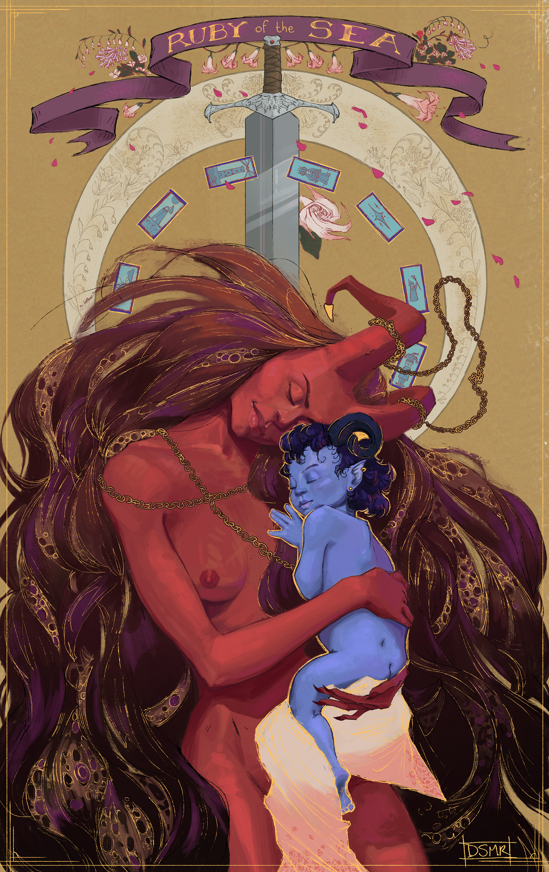 This fan-art I made features two characters from Critical Role: Marion Lavorre and her daughter Jester Lavorre (character created and played by Laura Bailey). It's inspired by Gustav Klimt's "Mother and Child", and the designs of Alphonse Mucha.